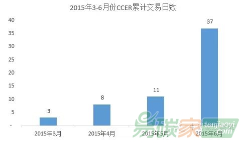 ccer的成交頻率是評價交易活躍程度的重要指標(biāo),截止6月底試點(diǎn)碳市場有成交記錄的月份為3-6月。根據(jù)對試點(diǎn)碳市場發(fā)布的交易信息的統(tǒng)計(jì)(不完全統(tǒng)計(jì)),履約期期間,即6月份是交易活躍程度最高的月份,6月份試點(diǎn)碳市場累計(jì)有37個交易日出現(xiàn)CCER交易,而3-5月份累計(jì)僅22個交易日有CCER交易。
