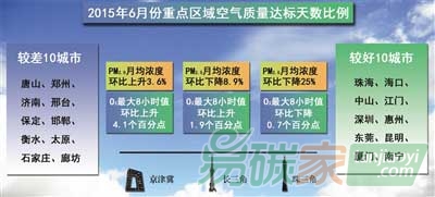 按照城市環(huán)境空氣質(zhì)量綜合指數(shù)評(píng)價(jià),6月空氣質(zhì)量相對(duì)較差的10個(gè)城市依次是唐山、鄭州、濟(jì)南、邢臺(tái)、保定、邯鄲、衡水、太原、石家莊和廊坊;空氣質(zhì)量相對(duì)較好的10個(gè)城市依次是珠海、海口、中山、江門(mén)、深圳、惠州、東莞、昆明、廈門(mén)和南寧。