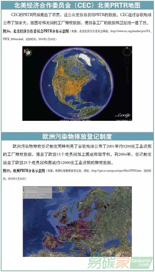 CEC的PRTR網(wǎng)站做出了示范,讓公眾更容易獲得PRTR的數(shù)據(jù)。CEC通過谷歌地球公布了加拿大,墨西哥和美國(guó)的工廠排放數(shù)據(jù),使得各工廠的數(shù)據(jù)和衛(wèi)星圖一目了然。