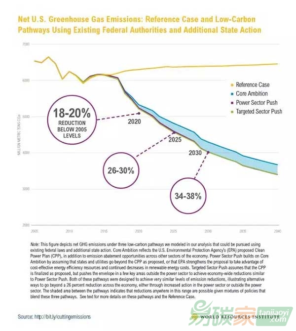 世界資源研究所論文《履行美國的氣候承諾》指出,即使在國會不采取行動的情況下,美國可以實現(xiàn)甚至超額完成到2020年溫室氣體排放比2005年降低17%、到2025年比2005年降低26%-28%的目標。雖然上述分析以“清潔電力計劃”建議稿為基礎(chǔ),該計劃的正式文本也規(guī)定到2020年和2025年需要達到類似的減排水平,因此論文的結(jié)論不受影響。