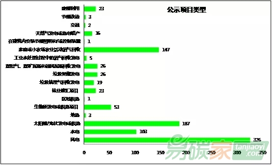 就項(xiàng)目類型而言,可再生能源項(xiàng)目占到項(xiàng)目總數(shù)的70%。在964個(gè)公示項(xiàng)目中,風(fēng)電項(xiàng)目326個(gè),水電103個(gè),光伏187個(gè),生物質(zhì)項(xiàng)目53個(gè),地?zé)?個(gè),可再生能源項(xiàng)目合計(jì)672個(gè)。除可再生能源外,戶用沼氣利用項(xiàng)目數(shù)量相對(duì)較多,共計(jì)147個(gè),占公示項(xiàng)目總數(shù)的15%。其余項(xiàng)目類型的數(shù)量相對(duì)較少,詳見下圖。