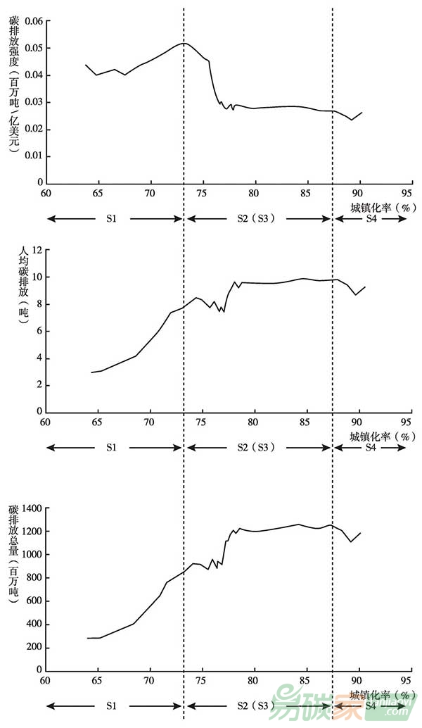 1950年以后,美國(guó)的第三產(chǎn)業(yè)得到了極大的發(fā)展,高新技術(shù)產(chǎn)業(yè)和現(xiàn)代服務(wù)業(yè)在經(jīng)濟(jì)社會(huì)中所占比重越來越大,并對(duì)城鎮(zhèn)的人口與空間結(jié)構(gòu)分布產(chǎn)生了重要影響。在這之后近50年的時(shí)間里,美國(guó)的城鎮(zhèn)化率只有近10%的增長(zhǎng),其增長(zhǎng)速度逐漸放緩。這一時(shí)期美國(guó)的城鎮(zhèn)化發(fā)展主要表現(xiàn)為大都市化和城鎮(zhèn)人口的郊區(qū)化。美國(guó)郊區(qū)人口從1950年的4023萬(wàn)人增長(zhǎng)到2000年的1.4億人,同期美國(guó)郊區(qū)人口的比重由26.7%增長(zhǎng)到49.8%,這一時(shí)期美國(guó)城鎮(zhèn)人口的增量主要分布在郊區(qū)。美國(guó)的城鎮(zhèn)向郊區(qū)發(fā)展,在一定程度上改善了城市的空間結(jié)構(gòu)布局,但也造成了土地的粗放利用,使得城市過度蔓延。為了滿足郊區(qū)居民的生活需求,美國(guó)實(shí)行了分戶供電、供水,獨(dú)立取暖等制度,相對(duì)于集中供熱、供水來說,這些舉措造成了更多的能源浪費(fèi)。因此S1階段以后,美國(guó)的城鎮(zhèn)化經(jīng)歷很長(zhǎng)一段時(shí)間的發(fā)展,城鎮(zhèn)化率達(dá)到75%左右時(shí),其人均碳排放才實(shí)現(xiàn)峰值,完成了S2階段的發(fā)展。同時(shí)伴隨著城市郊區(qū)的發(fā)展,相關(guān)的生活配套設(shè)施的建設(shè)也緊隨其后,盡管其碳排放強(qiáng)度在不斷下降,人口總量也沒有太大的波動(dòng),但其碳排放總量在人均碳排放實(shí)現(xiàn)峰值以后,仍然有很大程度的增長(zhǎng)。在美國(guó)的城鎮(zhèn)化率發(fā)展到81%時(shí),其碳排放總量有一定程度的回落。這是否意味著隨著城鎮(zhèn)化的發(fā)展美國(guó)的碳排放已經(jīng)跨越了S3階段,實(shí)現(xiàn)了碳排放的峰值,還有待進(jìn)一步觀察和檢驗(yàn)。