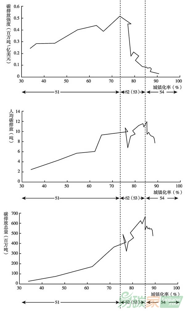 隨著工廠規(guī)模的擴(kuò)大,傳統(tǒng)的農(nóng)村小作坊已經(jīng)不能滿足社會(huì)的需求,工業(yè)集聚現(xiàn)象日益明顯,英國(guó)的城鎮(zhèn)化進(jìn)程被快速推進(jìn)。在這之后50年左右的時(shí)間里,英國(guó)的城鎮(zhèn)化水平增長(zhǎng)到70%多,基本上實(shí)現(xiàn)了高度的城鎮(zhèn)化,并形成了一大批城市群。而此時(shí)英國(guó)的碳排放強(qiáng)度也達(dá)到峰值,碳排放隨著城鎮(zhèn)化完成了S1階段的發(fā)展,后期人均碳排放與碳排放總量的增長(zhǎng)主要由經(jīng)濟(jì)增長(zhǎng)推動(dòng)。在實(shí)現(xiàn)高度城鎮(zhèn)化以后,英國(guó)的城鎮(zhèn)化發(fā)展進(jìn)程逐漸由城鎮(zhèn)人口的增長(zhǎng)轉(zhuǎn)向城鎮(zhèn)人口和布局的優(yōu)化。由于科技進(jìn)步的抑制作用以及人口總量趨于穩(wěn)定,在其城鎮(zhèn)化率達(dá)到85%左右時(shí),人均碳排放與碳排放總量幾乎同時(shí)實(shí)現(xiàn)了排放峰值),碳排放隨著城鎮(zhèn)化發(fā)展的演變由四個(gè)階段變?yōu)槿齻€(gè)階段。在這之后,英國(guó)城鎮(zhèn)化的進(jìn)一步發(fā)展并沒有帶來碳排放的增長(zhǎng),城鎮(zhèn)化、經(jīng)濟(jì)增長(zhǎng)與碳排放逐步實(shí)現(xiàn)剝離或脫鉤。