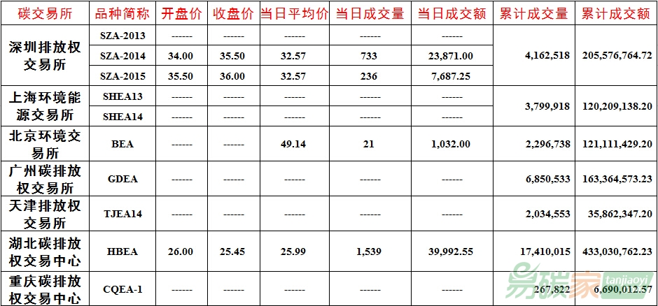 品種HBEA成交1,539噸,成交額39,992.55元,收盤價25.45元,較前一交易日上漲1.30%。截止當日,湖北碳市場配額總成交量17,410,015噸,總成交額433,030,762.23元。