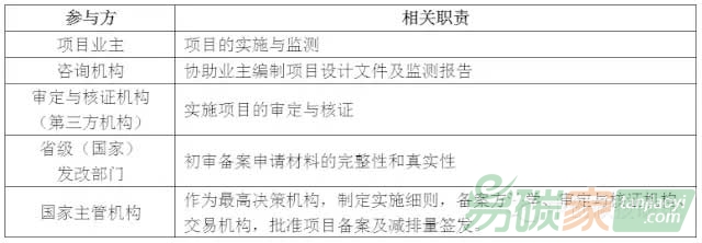 第三方審定與核證機(jī)構(gòu)、省級(jí)(國(guó)家)發(fā)改部門與國(guó)家主管機(jī)構(gòu)等,主要參與方與其職責(zé)如下表所示。