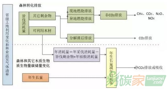 根據(jù)UNFCCC和IPCC指南的要求,結(jié)合中國的實際情況,目前省級LUCF溫室氣體清單中的“土地利用變化”主要評估“有林地轉(zhuǎn)化為非林地”過程中的溫室氣體源排放或匯清除。暫不考慮林地與其它土地利用類型、以及其它土地利用類型之間的相互轉(zhuǎn)化。即以下兩種人類活動引起的二氧化碳(CO2)吸收或排放:森林和其它木質(zhì)生物質(zhì)生物量碳貯量變化,森林轉(zhuǎn)化
