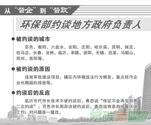 據(jù)《法制日?qǐng)?bào)》記者了解,包括百色市,環(huán)保部近一年來(lái)共約談了衡陽(yáng)、六盤(pán)水、安陽(yáng)、昆明、沈陽(yáng)、哈爾濱、長(zhǎng)春、滄州、臨沂、承德、鄭州等12城市的政府主要負(fù)責(zé)人。
