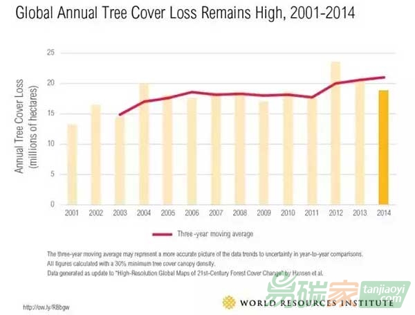 2014年,全球林木流失面積超過(guò)1800萬(wàn)公頃(4500萬(wàn)英畝),相當(dāng)于葡萄牙國(guó)土面積的兩倍。其中,熱帶國(guó)家林木流失面積達(dá)990萬(wàn)公頃(2450萬(wàn)英畝),占全球林木流失總面積的一半以上。林木流失計(jì)算的是任何原因引起的樹(shù)木移除或死亡,包括從印度尼西亞的熱帶雨林到歐洲管理有序的種植林等所有林木覆蓋類型。影響全球森林景觀的另一個(gè)重要?jiǎng)討B(tài)因素——林木面積增長(zhǎng)并未包含在上述數(shù)據(jù)之內(nèi)。