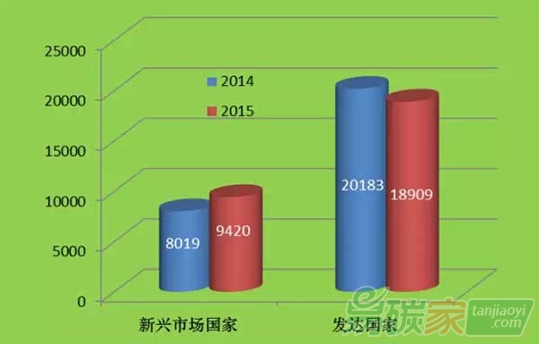 圖4  2014、2015“500強(qiáng)”發(fā)達(dá)國家與新興市場國家上榜企業(yè)總營業(yè)收入(單位:億元)