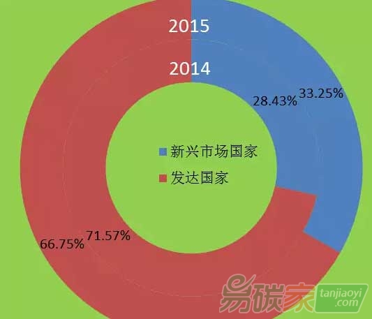 圖5  2014、2015“500強(qiáng)”發(fā)達(dá)國家與新興市場國家上榜企業(yè)總營收占比圖