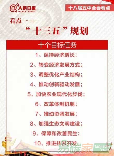 人民日?qǐng)?bào)官方微博公布“十三五”規(guī)劃的十個(gè)任務(wù)目標(biāo):1、保持經(jīng)濟(jì)增長(zhǎng),2、轉(zhuǎn)變經(jīng)濟(jì)發(fā)展方式,3、調(diào)整優(yōu)化產(chǎn)業(yè)結(jié)構(gòu),4、推動(dòng)創(chuàng)新驅(qū)動(dòng)發(fā)展,5、加快農(nóng)業(yè)現(xiàn)代化步伐,6、改革體制機(jī)制,7、推動(dòng)協(xié)調(diào)發(fā)展,8、加強(qiáng)生態(tài)文明建設(shè),9、保障和改善民生,10、推進(jìn)扶貧開(kāi)發(fā)。其中,加強(qiáng)生態(tài)文明建設(shè)(美麗中國(guó))是首度寫(xiě)入五年規(guī)劃。