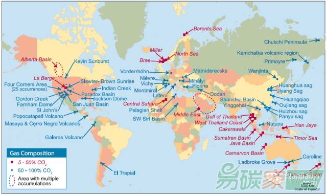 天然二氧化碳?xì)鈱臃植紙D IPCC Special Report on Carbon dioxideCapture and Storage, 2005
