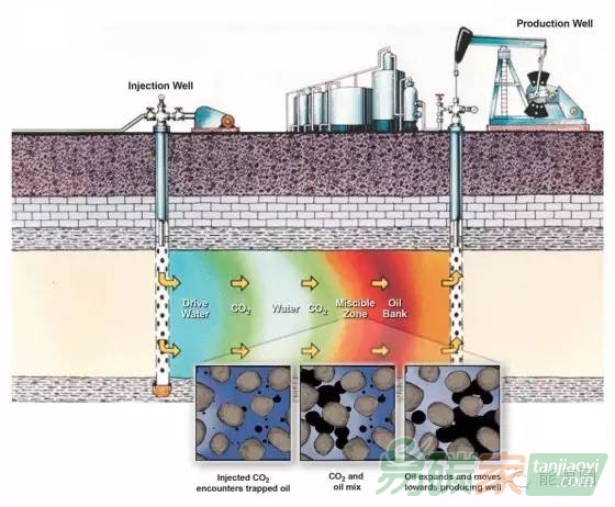 而將二氧化碳注入到地層中,其實(shí)也已經(jīng)應(yīng)用多年了。在石油工程的領(lǐng)域,科學(xué)家們發(fā)現(xiàn)油氣層在開采之初,因?yàn)榈氐讐毫^大,油氣可以直接噴出地表。但隨著開采而壓力降低,使得油氣的采集變得困難,因而陸續(xù)開發(fā)了注入水、蒸氣等開采技術(shù)。而近年來發(fā)現(xiàn)若將二氧化碳注入油氣層中,除了可以封存二氧化碳以外,二氧化碳在溶于原油中,可使原有的體積膨脹、密度與黏度下降、流動(dòng)性變好更適宜開采,能有效提升油田的壽命與效率。