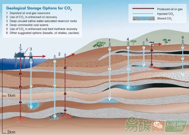 地質(zhì)二氧化碳封存的方式: 1. 枯竭油氣礦, 2.提高石油采收率, 3. 鹽水層封存, 4. 無法開采的深煤層, 5. 回收煤層天然氣 6. 其他可行方式(玄武巖、油頁巖、地層內(nèi)空腔) IPCC SpecialReport on Carbon dioxide Capture and Storage, 2005