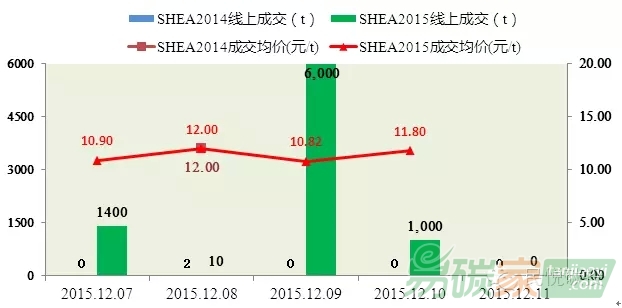 上周上海碳市僅在12月08日,有配額SHEA14成交,成交量為2噸。SHEA15除12月11日外,每日均有成交,總成交量為8,410噸。成交均價(jià)在10.82元/噸~12.00元/噸范圍內(nèi)波動(dòng)。