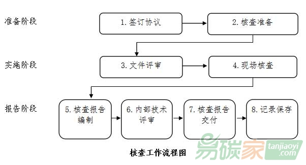 核查機(jī)構(gòu)應(yīng)按照規(guī)定的程序進(jìn)行核查,主要步驟包括簽訂協(xié)議、核查準(zhǔn)備、文件評審、現(xiàn)場核查、核查報(bào)告編制、內(nèi)部技術(shù)評審、核查報(bào)告交付及記錄保存等8個(gè)步驟(見圖1)。核查機(jī)構(gòu)可以根據(jù)核查工作的實(shí)際情況對核查程序進(jìn)行適當(dāng)?shù)恼{(diào)整,但調(diào)整的理由應(yīng)在核查報(bào)告中予以詳細(xì)說明。