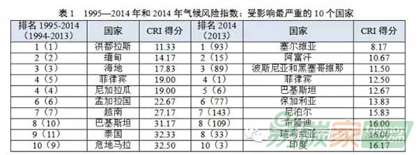 《全球氣候風(fēng)險(xiǎn)指數(shù)2016》指出,1995—2014年,洪都拉斯、緬甸和海地是受極端天氣事件影響最大的國家,排名前十的國家中有9個(gè)是低收入或中低收入國家,僅有1個(gè)(泰國)是中高收入國家(表1)。