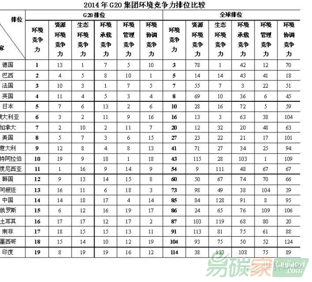 2014年G20集團(tuán)環(huán)境競爭力排位比較