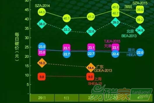 深圳碳市13年配額持續(xù)無交易;14年配額價(jià)格收于39.15元/噸;成交量較上周明顯下跌,為3,457噸,成交額為142,104.50元;15年配額價(jià)格收于39.60元/噸,較上周跌幅約為12%;成交量回升,為3,038噸,成交額為120,538.10元。本周