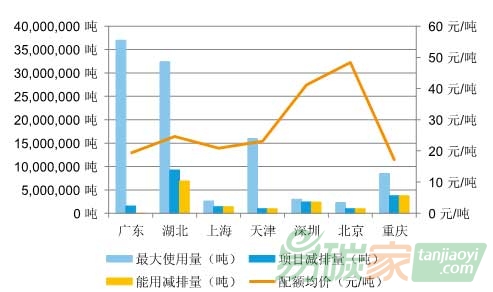 最大使用量是指某試點(diǎn)地區(qū)理論上最多能使用的CCER減排量;項(xiàng)目減排量是指能在某試點(diǎn)地區(qū)使用的CCER項(xiàng)目已經(jīng)備案的減排量總量;能用減排量是指某試點(diǎn)地區(qū)在合規(guī)的CCER項(xiàng)目中,能夠使用的減排量總量。