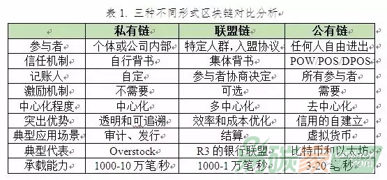 因此,根據(jù)不同的應(yīng)用場(chǎng)景和發(fā)展階段,國(guó)內(nèi)資本市場(chǎng)可能采用模式的是:在初級(jí)階段,機(jī)構(gòu)內(nèi)部采用私有鏈來(lái)改造升級(jí)現(xiàn)有系統(tǒng);技術(shù)成熟后,推廣到行業(yè)應(yīng)用,形成聯(lián)盟鏈;而公有鏈由于效率低、監(jiān)管難則難以被用于行業(yè)應(yīng)用。如表1所示,三種鏈各有應(yīng)用場(chǎng)景,優(yōu)勢(shì)各有不同。三種鏈共同點(diǎn)包括公開(kāi)透明、不可篡改和可追溯等,但是去中心化程度不同,最大的區(qū)別在于共識(shí)機(jī)制和信任的建立。當(dāng)然,區(qū)塊鏈應(yīng)用的演進(jìn)方式可能會(huì)像其他新技術(shù)應(yīng)用一樣,走“農(nóng)村包圍城市”路線(xiàn),先從周邊輔助應(yīng)用、小額低頻交易應(yīng)用逐步成熟,再滲透到金融核心應(yīng)用、高頻率大規(guī)模的交易應(yīng)用。