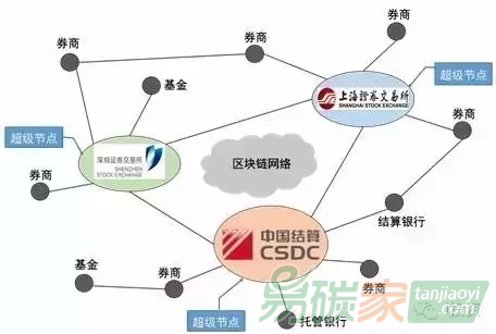 第一階段之后,區(qū)塊鏈應(yīng)用將會(huì)由主要機(jī)構(gòu)主導(dǎo),逐步推廣至證券行業(yè)應(yīng)用,形成聯(lián)盟鏈,多中心,交易所和登記結(jié)算機(jī)構(gòu)為超級(jí)節(jié)點(diǎn),負(fù)責(zé)協(xié)調(diào)和組織各個(gè)節(jié)點(diǎn)的運(yùn)營(yíng),如圖15所示。