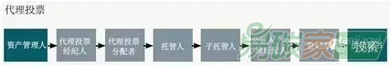 如圖8和圖9所示,目前廣泛運用的股東代理投票機制是由一套繁雜的程序構成的。通常資產(chǎn)管理人向代理投票經(jīng)紀人發(fā)出投票指令,指令隨后被傳遞給投票分配者,再由投票分配者將指令傳遞給托管人以及子托管人。托管人請求公證人對投票指令進行公證,然后向登記方申請并完成登記,最后投票信息匯總到公司秘書處。這是一個非常復雜且非標準化的流程,投票信息存在被不正確傳遞或丟失的風險。此外,由于托管人及子托管人使用不同的傳輸系統(tǒng)和字符識別系統(tǒng),導致投票的追溯和確認非常困難。荷蘭一家研究機構的研究成果指出,在荷蘭使用代理投票系統(tǒng)的公司中,僅僅有31%的公司能夠確認自己代理投票的結果。