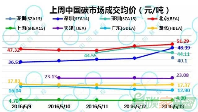 北京成交35.4萬噸,與前一周相比上升262%。上海成交80.5萬噸,與前一周相比上升12%。天津成交180噸,與前一周相比下降40%。廣東成交42.4萬噸,與前一周相比上升973%。湖北成交24.1萬噸,與前一周相比下降47%;湖北現(xiàn)貨遠期成交2557萬噸。重慶無成交。截至2016年5月13日,七試點累計成交6983萬噸,累計成交額17.9億元。
