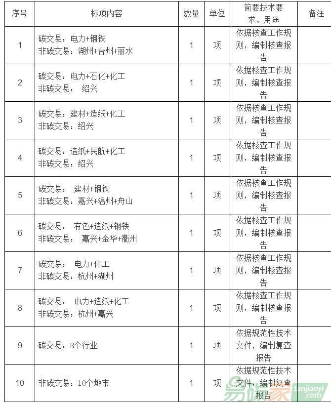 碳交易納入企業(yè)按行業(yè)劃分,非碳交易納入企業(yè)按地域劃分,分成核查8個標(biāo)項、復(fù)查2個標(biāo)項,共10個標(biāo)項,每個標(biāo)項確定一家服務(wù)機(jī)構(gòu)。