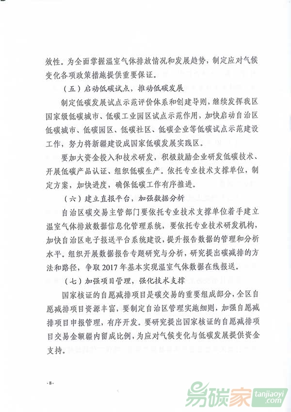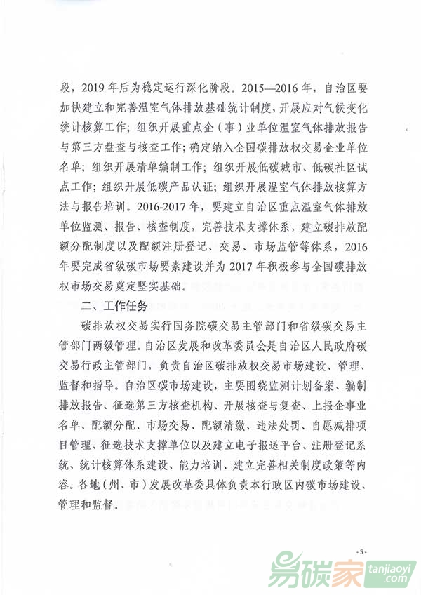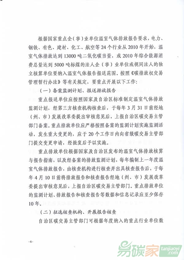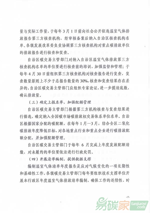 第三方盤查與核查;確定納入全國碳排放權(quán)交易企業(yè)單位名單等工作。2016-2017年,自治區(qū)要建立自治區(qū)重點溫室氣體排放單位監(jiān)測、報告、核查制度,完善技術(shù)支撐體系,建立碳排放配額分配制度及配額注冊登記、交易、市場監(jiān)管等體系。