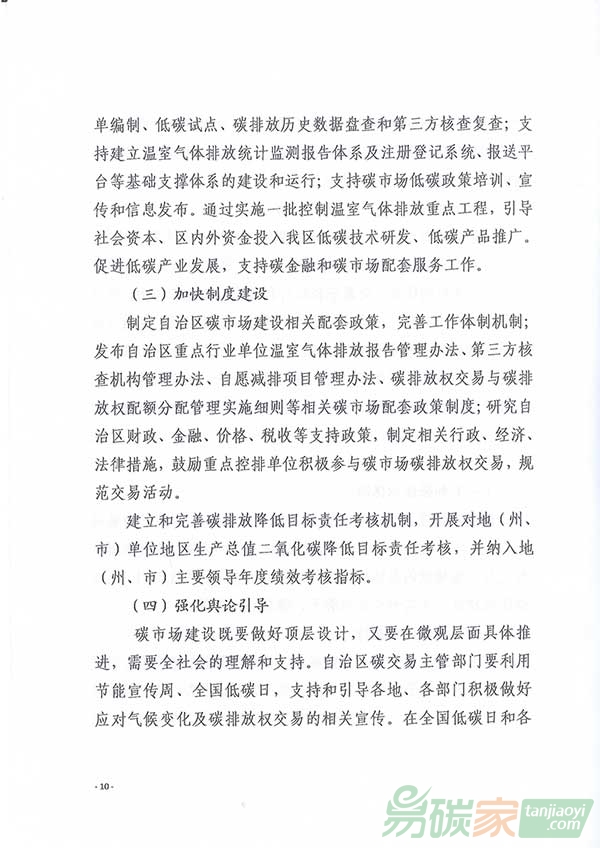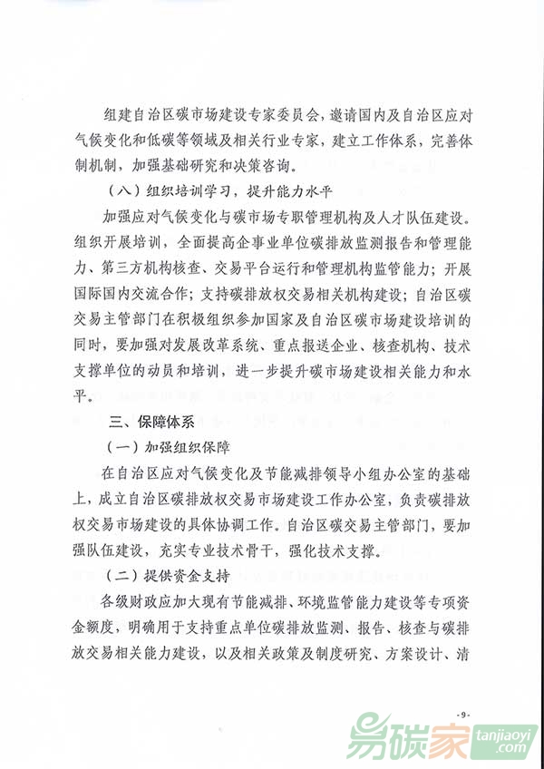 政策等內(nèi)容開展。采用加強組織保障、提供資金支持、加快制度建設(shè)及強化輿論引導(dǎo)等措施全面保障自治區(qū)碳市場的建設(shè)。