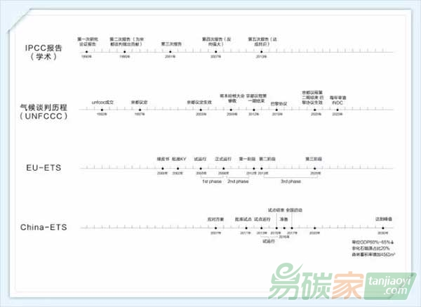 問題,即全球氣候變暖。美國氣象學(xué)家詹姆士·漢森于1975年首次提出,但那時他還默默無聞,直到1988年6月在參眾兩院的聽證會提出全球氣候變暖的概念才引起了重視。隨后一個叫IPCC的組織就成立了,中文叫“政府間氣候變化專門委員會”,它的作用是對世界上有關(guān)全球氣候變化的最好的現(xiàn)有科學(xué)、技術(shù)和社會經(jīng)濟信息進行評估,從1990起,每隔5-6年就會發(fā)布一次評估報告,也就是圖中第1條時間線所示的內(nèi)容,五次報告為碳交易奠定了科學(xué)基礎(chǔ),很多計算方法和工具,都是來自它們。