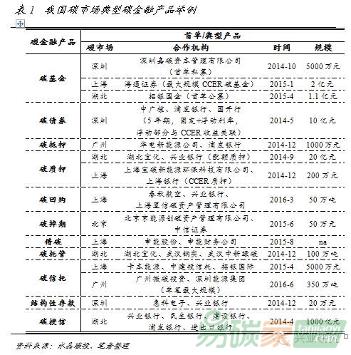 從試點(diǎn)開始至今,北京、上海、廣州、深圳、湖北5個(gè)試點(diǎn)市場(chǎng)已推出了近20種碳金融產(chǎn)品(參見表1)。以興業(yè)銀行為代表的股份制銀行,是目前我國(guó)參與碳金融市場(chǎng)最為積極的金融機(jī)構(gòu)。興業(yè)銀行作為全國(guó)首家采納“赤道原則”的銀行,不僅深耕綠色金融,在綠色金融領(lǐng)域也領(lǐng)先全國(guó)。興業(yè)銀行自2007年起便率先參與國(guó)內(nèi)碳交易市場(chǎng)建設(shè),目前已與全部7個(gè)試點(diǎn)碳市場(chǎng)達(dá)成合作關(guān)系,在碳交易制度設(shè)計(jì)咨詢、交易及清算系統(tǒng)開發(fā)、碳資產(chǎn)質(zhì)押授信、節(jié)能減排項(xiàng)目融資等方面提供一攬子產(chǎn)品與服務(wù)。2014年11月上線的深圳碳交易代理開戶系統(tǒng),是全國(guó)首個(gè)也是唯一基于銀行網(wǎng)上平臺(tái)進(jìn)行碳交易代理開戶的系統(tǒng),參與碳交易市場(chǎng)的國(guó)內(nèi)機(jī)構(gòu)和個(gè)人可通過該行個(gè)人網(wǎng)銀直接開通深圳排放權(quán)交易所賬戶。此外,興業(yè)銀行開發(fā)了碳資產(chǎn)評(píng)估工具、國(guó)際碳資產(chǎn)質(zhì)押授信業(yè)務(wù)、碳減排量銷售協(xié)議、碳交付保函、CCER交易結(jié)算和資金存管、碳排放權(quán)質(zhì)押貸款等業(yè)務(wù),均開創(chuàng)了國(guó)內(nèi)先河,形成了國(guó)內(nèi)首家推出涉及碳交易前、中、后臺(tái)全產(chǎn)業(yè)鏈的碳金融綜合服務(wù)機(jī)構(gòu)。