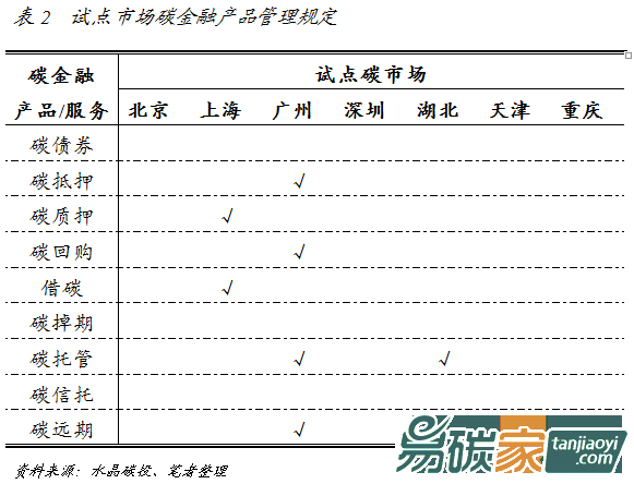 各試點(diǎn)市場(chǎng)交易所也積極與銀行等金融機(jī)構(gòu)合作,探索碳金融產(chǎn)品與服務(wù)的管理體制,針對(duì)部分碳金融產(chǎn)品和服務(wù)出臺(tái)了相關(guān)管理規(guī)定(參見表2)。全國(guó)市場(chǎng)啟動(dòng)后,一方面需要統(tǒng)一已有管理規(guī)定、填補(bǔ)空缺的管理規(guī)則,同時(shí)還需要推廣有關(guān)機(jī)構(gòu)現(xiàn)有參與碳金融市場(chǎng)、開發(fā)碳金融產(chǎn)品與服務(wù)的經(jīng)驗(yàn),引導(dǎo)更多的銀行、券商等金融機(jī)構(gòu)積極參與,真正推動(dòng)我國(guó)碳市場(chǎng)及碳金融體系深化發(fā)展。