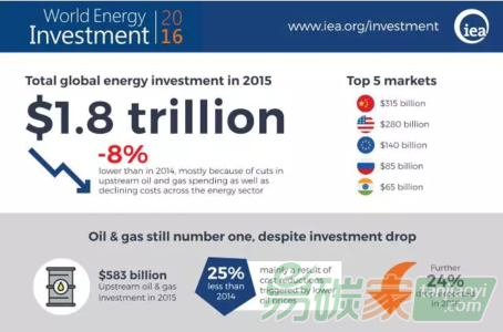 節(jié)能等領(lǐng)域的投資情況。報(bào)告指出,2015年度世界能源投資總額達(dá)1.8萬億美元。受原油和天然氣價(jià)格下跌的影響,2015年的能源投資總額比上一年減少8%。與油氣領(lǐng)域投資相反,可再生發(fā)電、核能、電網(wǎng)建設(shè)和節(jié)能的投資比例均有所增長。
