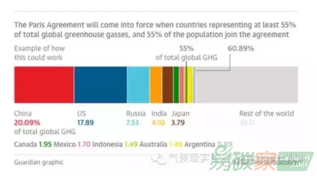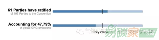 目前197個(gè)締約方中有61個(gè)已經(jīng)批準(zhǔn)通過,滿足了55個(gè)締約方批準(zhǔn)通過協(xié)定的要求。但在溫室氣體排放量上,目前批準(zhǔn)協(xié)定的締約方只占了47.79%,仍有7.21%的排放量沒有達(dá)標(biāo)。