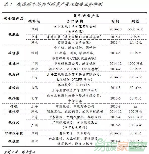 從2013年碳市場試點啟動至今,北京、上海、廣州、深圳、湖北5個試點市場已推出了近20種碳資產管理相關的業(yè)務。以興業(yè)銀行為代表的股份制銀行,是目前我國參與碳金融市場最為積極的金融機構。興業(yè)銀行作為全國首家采納“赤道原則”的銀行,在碳金融領域也領先全國。興業(yè)銀行自2007年起便率先參與國內碳交易市場建設,目前已與全部7個試點碳市場達成合作關系,在碳交易制度設計咨詢、交易及清算系統(tǒng)開發(fā)、碳資產質押授信、節(jié)能減排項目融資等方面提供一攬子產品與服務。此外,興業(yè)銀行開發(fā)了碳資產評估工具、國際碳資產質押授信業(yè)務、碳減排量銷售協(xié)議、碳交付保函、CCER交易結算和資金存管、碳排放權質押貸款等業(yè)務,均開創(chuàng)了國內先河,形成了國內首家推出涉及碳交易前、中、后臺全產業(yè)鏈的碳金融綜合服務機構。