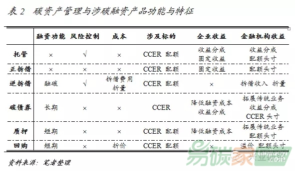 碳資產管理與涉碳融資各類業(yè)務的基本功能,以及對于控排企業(yè)和金融機構的影響,如下表所示。