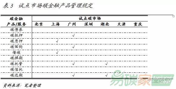 完善配套管理政策,明確操作指引:碳金融體系作為我國金融系統(tǒng)以及節(jié)能減排政策體系中共同的新生事物,具有客觀的發(fā)展?jié)摿Γ瑫r也需要適當的引導和管理。在碳質押、回購、拆借、托管等業(yè)務中,都涉及碳資產的轉移占有,因而面臨服務機構的信用風險;反過來拆借、碳債券等業(yè)務同樣也會面臨企業(yè)的信用風險。此外,金融機構獲得了碳資產頭寸,可以在二級市場進行交易,但頭寸的過度集中也會對市場的平穩(wěn)和有效性造成損害。因此,需要對碳金融服務相關業(yè)務制定針對性的監(jiān)管與風險控制規(guī)則。目前在相關業(yè)務創(chuàng)新的探索過程中,各試點市場交易所正在摸索相應的管理體制,針對部分碳金融產品和服務出臺了相關管理規(guī)定(如下表所示)。在全國碳市場啟動后,需要對這些管理規(guī)定進行進一步的統(tǒng)一和細化,制定明確的操作指引,引導碳金融服務健康、快速發(fā)展。