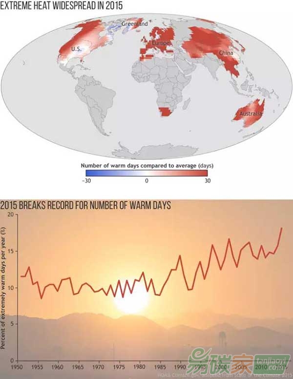 世界氣象組織11月8日發(fā)布了對2011-2015年(有記錄以來最熱的五年)全球氣候的詳細(xì)分析以及對有危害且代價(jià)高的極端天氣和氣候事件日漸清晰的人類足跡的詳細(xì)分析。創(chuàng)紀(jì)錄的溫度伴隨著海平面上升、北極海冰范圍縮小、大陸冰川和北半球積雪減少。所有這些氣候變化指標(biāo)都確認(rèn)了溫室氣體所造成的長期變暖趨勢。