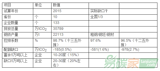 根據(jù)上報(bào)的最新的數(shù)據(jù)情況進(jìn)行了試算。由于沒有2017年的數(shù)據(jù),采用的是2015年(2013年、2014年、2015年)的數(shù)據(jù),產(chǎn)量用的是2015年的數(shù)據(jù),以此來計(jì)算碳配額缺口或富余情況。我們選擇了10個(gè)省份,涵蓋中西部的大型、小型鋼鐵企業(yè)133家,排放總量大概為3.6億噸,鋼鐵產(chǎn)量大概為2.2億噸,占2016年粗鋼產(chǎn)量的1/4左右。