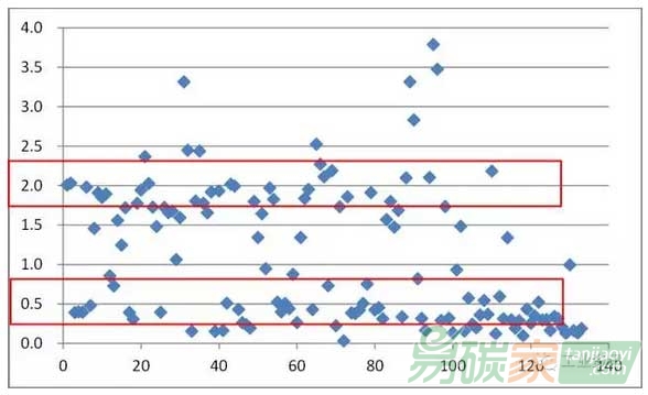 同樣,我們對(duì)企業(yè)的碳排放強(qiáng)度也進(jìn)行了一個(gè)統(tǒng)計(jì)。如下圖所示,排除掉數(shù)據(jù)異常的點(diǎn),基本可以看出碳排放強(qiáng)度集中在2個(gè)方面,一個(gè)是長(zhǎng)流程方面,碳排放強(qiáng)度約為2TCO2/t,在圖中紅色區(qū)域可以看到這一區(qū)域的樣本相對(duì)密集,另一個(gè)是短流程方面,碳排放強(qiáng)度約為0.5 TCO2/t左右。下圖基本反映了這2個(gè)方面的規(guī)律。