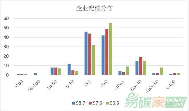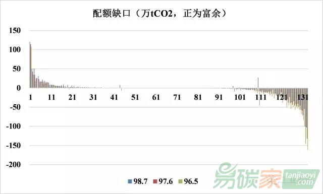 經(jīng)過計(jì)算和對(duì)比,大概有15%的企業(yè)(10~20家)碳配額富余超過5萬噸,而配額缺口超過5萬噸的有20~30家,占總數(shù)的20%左右。