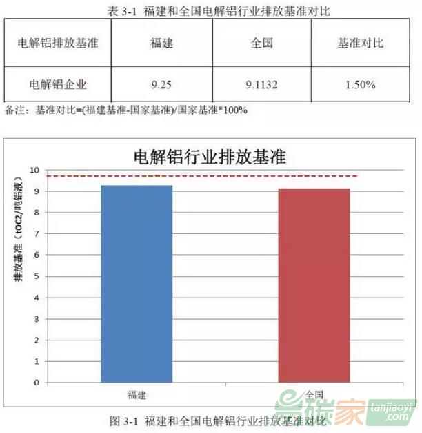 電解鋁行業(yè)配額=鋁液產(chǎn)量×排放基準(zhǔn)值,福建省和全國(guó)公式完全一致。具體排放基準(zhǔn)對(duì)比見(jiàn)下表3-1和圖3-1: