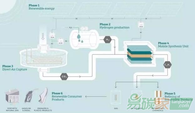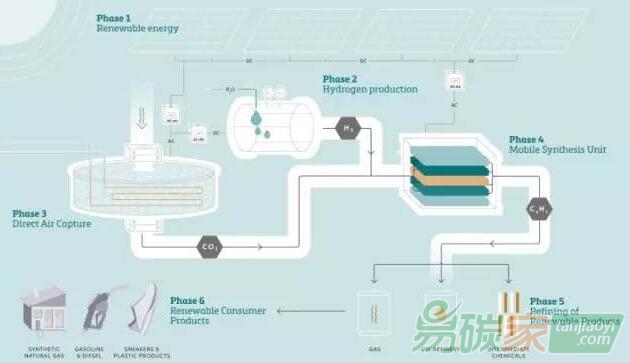演示工廠包括四個(gè)獨(dú)立的單元:一個(gè)太陽能發(fā)電廠 ; 從空氣中分離二氧化碳和水的設(shè)備; 使用電解產(chǎn)生氫的部分; 以及用于從二氧化碳和氫氣生產(chǎn)原油替代物的合成設(shè)備。