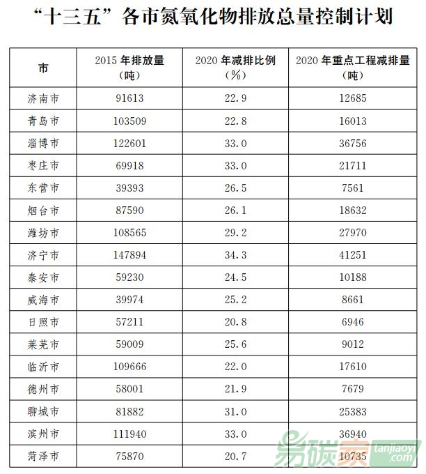 山東省“十三五”各市氮氧化物排放總量控制計劃