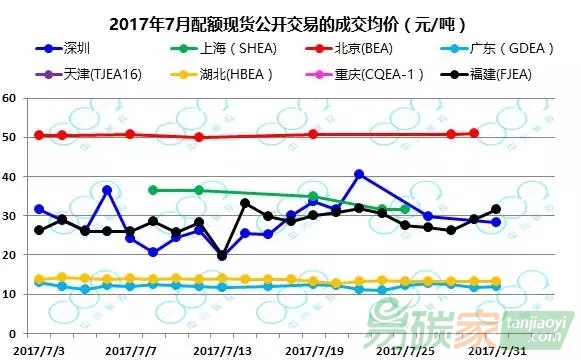 北京試點配額價格最高,7月公開交易均價為50.73元/噸;上海次之,為31.56元/噸;然后是