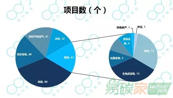 從項目類別看,已獲得減排量備案且材料公示的254個項目中,有第一類項目139個,合計備案減排量1890萬噸CO2e;第二類項目17個,備案減排量372萬噸CO2e;第三類項目98個,備案減排量3031萬噸CO2e。從項目類型看,風電、光伏、農村戶用沼氣、水電等項目較多,詳細情況如下圖所示。