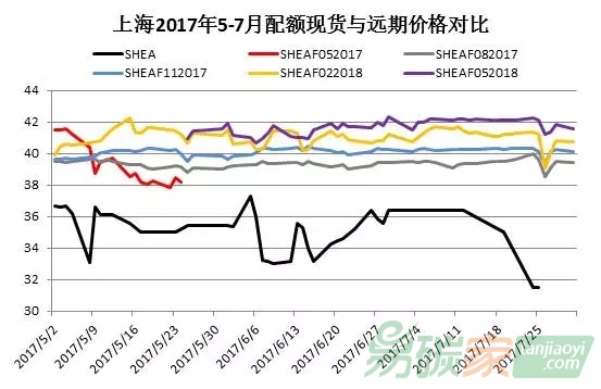 上海目前有SHEA052017、SHEA082017、SHEA112017、SHEA022018、SHEA022018五個遠期產品,其中SHEA052017已交割。上海配額現(xiàn)貨與遠期的價格對比如下圖,其中現(xiàn)貨以黑色表示,遠期以其它顏色表示。