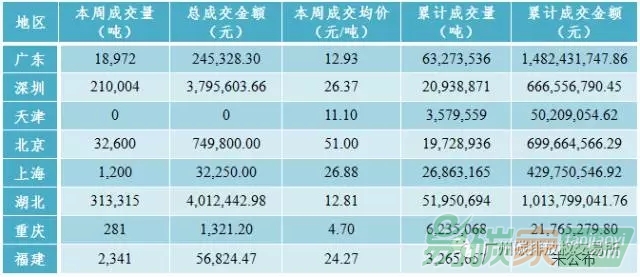 市場活躍度大幅上升,共成交配額57.87萬噸,較前一周上漲160.98%,總成交金額為889.36萬元,較前一周上周上漲150.88%。廣東